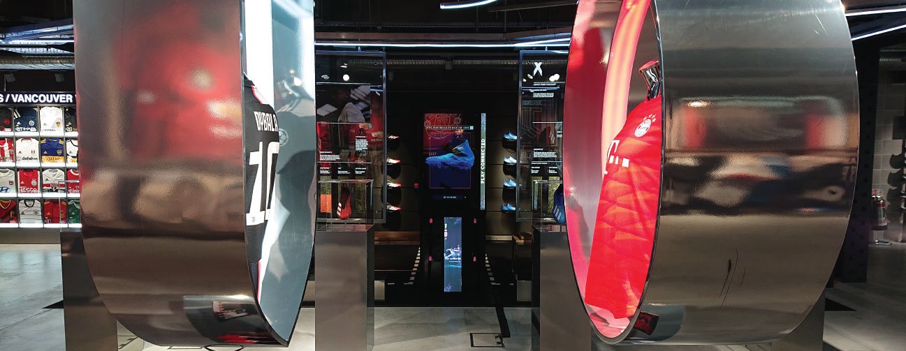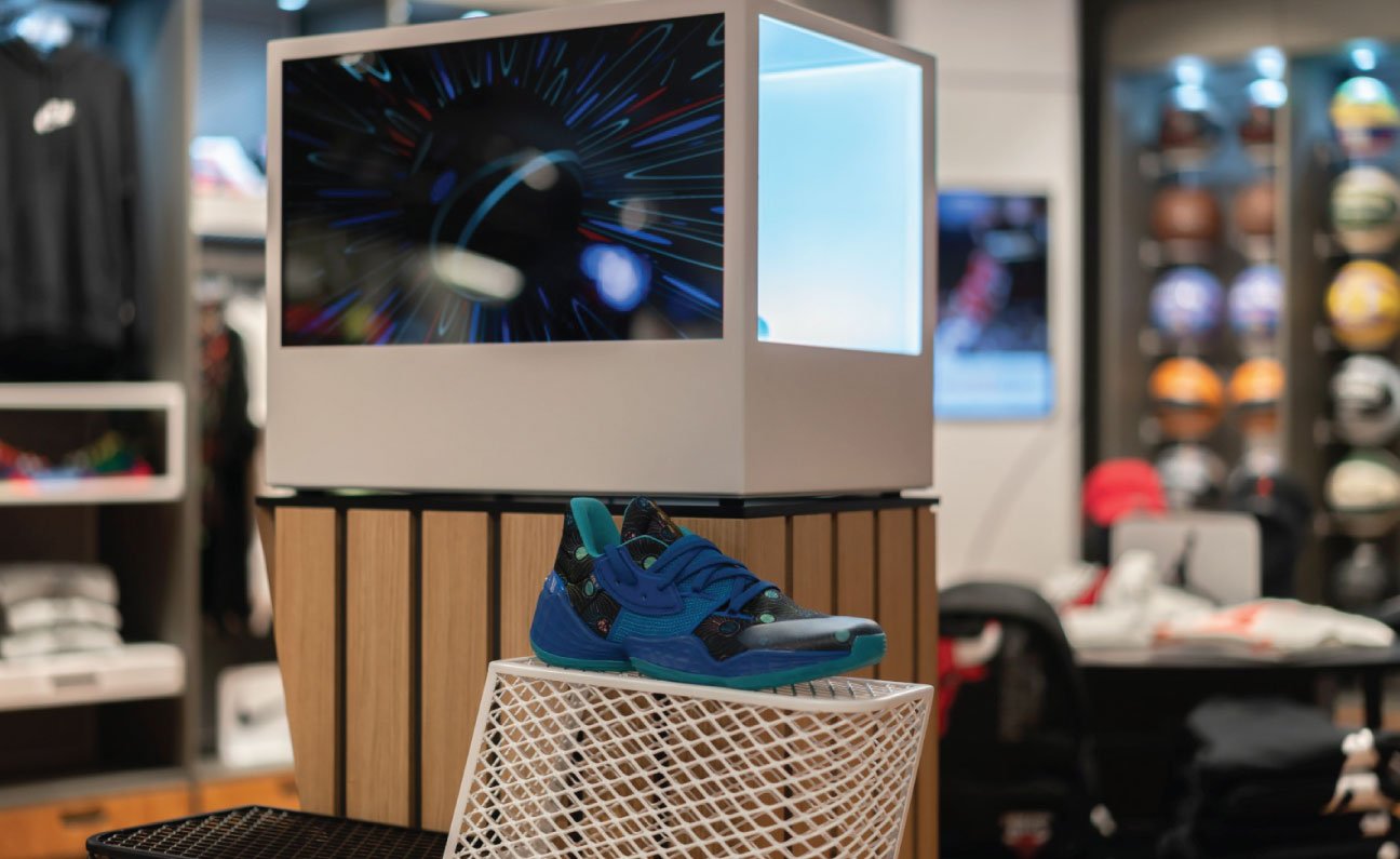 Traditionally Transparent LCD’s have had to be integrated into the housing to produce the most effective display or manufactured as a finished transparent showcase. However, Nikes House of Innovation paired our Transparent LCD Screens with oversized backlights that spread past the bezel of the screens, allowing them to be mounted away from the wall with no surround and still output high-quality images.
