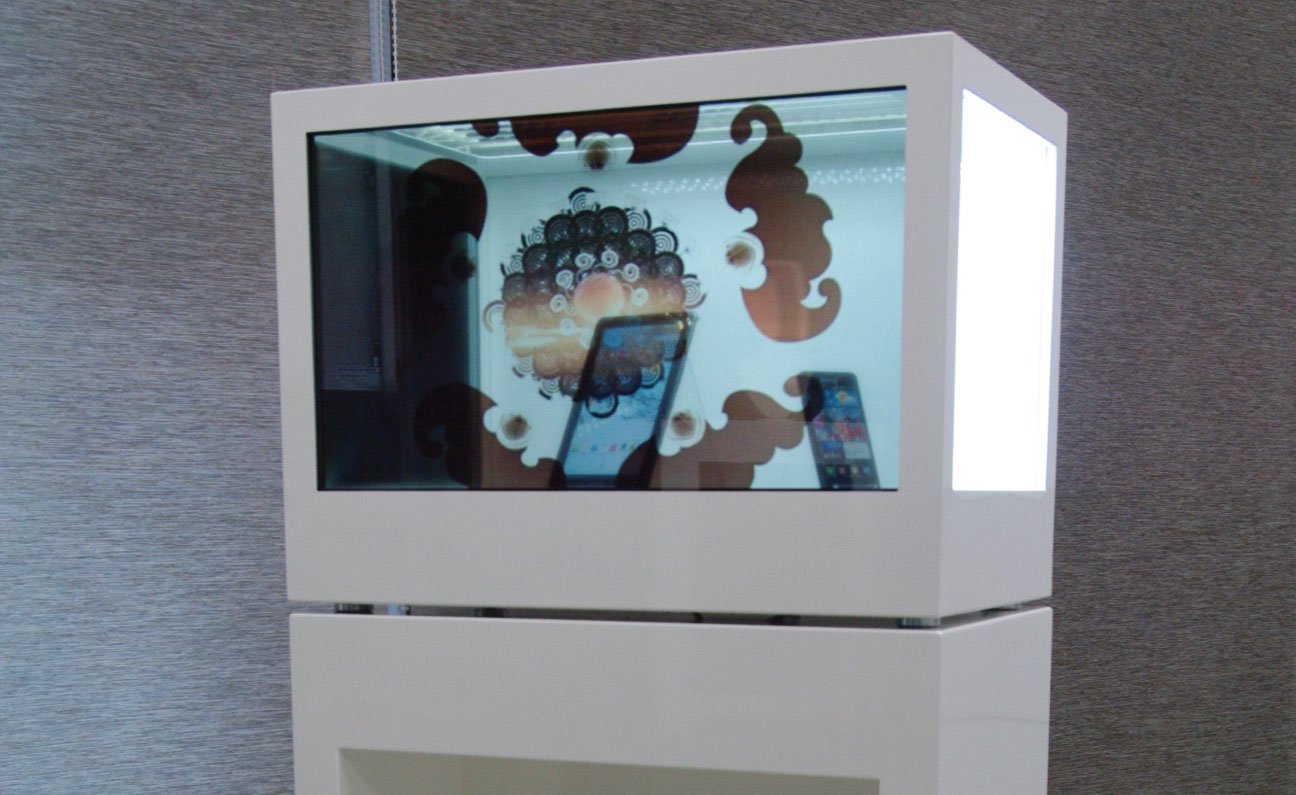 Until recently, Transparent Display cases have been manufactured as a complete surround for the screen, however recently we’ve completed several projects that experimented with different configurations and light sources to produce the same high quality displays. One such bespoke project included a custom built steel totem with an integrated transparent touch screen at the centre of the display. The housing for the display contained clear acrylic side panels so the contents of the box could be seen from wider viewing angles, with a more powerful LED light panel integrated behind the display to compensate for the light escape on the clear panels.