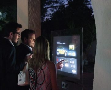 Car makers are always looking for new and innovative ways to advertise and inspire customer purchases with large format projection on external glazing, interactive touch kiosks and switchable glass display cases all popular choices.