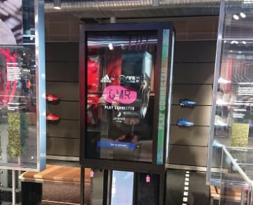 Nike implemented our Transparent Screens in a unique way in their 3rd ‘House of Innovation’ in Paris, France. Rather than building the screen into a surrounding housing as standard, the screens were paired with a powerful oversized backlight creating a more minimalist display solution. These screens were dotted around the store as futuristic way finders fitting perfectly into the store’s interior. We’ve also supplied interactive Transparent LCD Kiosks for Adidas’s GMR roll out, featuring in stores in London, New York and Vancouver.
