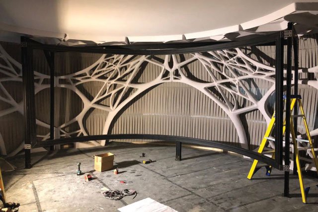 By using a rear projection screen the cast and crew could move freely around the set without having to worry about casting shadows over the screen and disrupting the image. The specialist optical projection surface was designed to produce high contrast 4K images on the surface, offering a superior performance in the carefully controlled studio environment. Our curved rear projector screen was the perfect solution to suit the unique design of the set, producing an effect that could not be recreated with competing LCD and LED technologies. The matt surface of our screen also made sure there was no glare or reflection from other elements of the set like lighting systems.