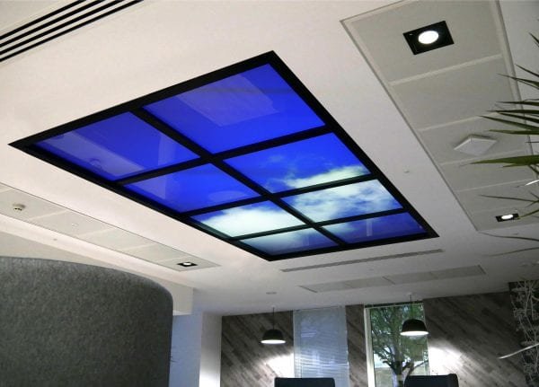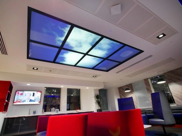 In a more contextual consideration, this application offers the client a range of pioneeringly creative opportunities, such as being able to theme their environment with a chosen concept, where they could create a variety of effects by projecting different videos onto the ceiling, such as a different climate or a different time zone. As a great way to connect multinational corporations or even other branches of office, by using webcam feeds, for example, teams can be connected to an office on the other side of the planet by projecting a live feed of the sky from that location. This may be especially effective for companies that engage in night trading, night support or even night-time IT maintenance, as employees who take part in night time work can be helped to adjust and focus by synthesising a ‘day time’ environment regardless of what’s happening outside. As Mr Leslie explains, “The equipment is now there – we can just swap content for the Skylight. For example, we could project an underwater scene or project something across the skyline for Christmas using the Skylight.”