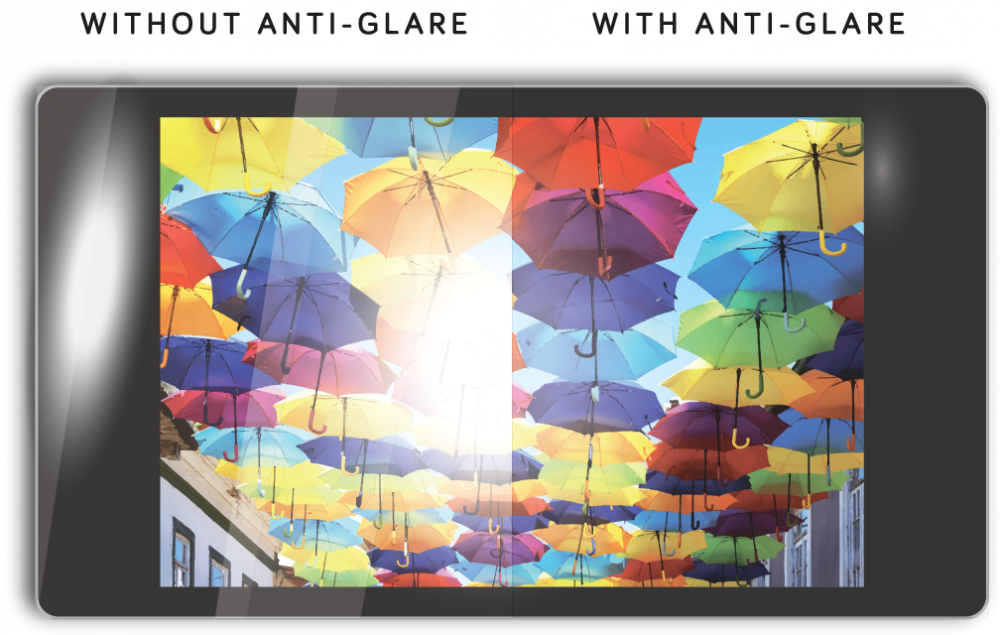Anti-reflective glass is manufactured with a matt finish, that diffuses glare and reflection caused by artificial lighting and daylight to make the content on the screen more visible in tricky environments. Our anti-glare glass also has the added benefit of protecting the screen itself from wear and tear by acting as a barrier.